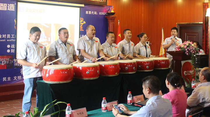 會(huì)議開始,全體員工整肅衣冠端身正意滿懷赤誠(chéng)之心向企業(yè)“孝道、商道、人道”行三鞠躬禮,宣讀企業(yè)愿景——成為全球領(lǐng)先的整廠自動(dòng)化系統(tǒng)解決方案提供商,企業(yè)使命——做受尊敬的好人、造受尊敬的產(chǎn)品、辦受尊敬的企業(yè)、建受尊敬的平臺(tái),企業(yè)精神——用情做人、用心做事,團(tuán)隊(duì)精神——忠誠(chéng)團(tuán)結(jié)、勤奮進(jìn)取。隨后,匯興智造高管:鐘世鑫、胡偉路、呂常垣、黃艷、廖飛、張強(qiáng),共同敲響士氣鼓、鼓舞匯興智造奮勇前進(jìn)。