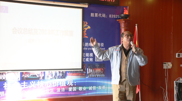 匯興智造副總經理辛曼玉以一句“2017,您幸福嗎?”開啟大會的第六項議程,作2017年年度工作報告。辛副總說:“在2017年,匯興智造實現了16年來都沒有實現的銷售業績;成立了研究院、技術研究中心等研發機構,公司的研發能力得到提高;調整了產品結構,拓展了行業范圍,并且守護住了傳統行業,夯實了業績;實現了配件事業的業績倍增,取得喜人成績;加強了人力資源建設,老員工在進步,能力在提升,而高學歷、高層次員工的加盟,讓匯興智造如虎添翼。這一年,雖然我們經歷了困難、挫折,但取得的成績是驕人的。匯興智造在往前走,往上走,我們在上坡的過程中,會氣喘,會腿酸,很累,但當我們爬上山頂的時候,那種‘會當凌絕頂,一覽眾山小’的豪情和喜悅卻是無法比擬的。所以,如果有人問:2017,您幸福嗎?我會回答:我很幸福!”