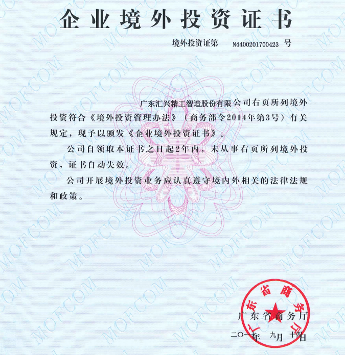 2017年8月29日,廣東匯興精工智造股份有限公司(股票代碼:839258)正式獲得企業(yè)對外投資證書。匯興智造赴德設(shè)立全資子公司,是響應(yīng)國家‘一帶一路’這個偉大重要的戰(zhàn)略,從而實現(xiàn)公司可持續(xù)發(fā)展。“一帶一路”戰(zhàn)略的實施,為我們民營企業(yè)“走出去”創(chuàng)造出了難得的歷史機遇。新的機遇,既要看天氣,更要接地氣,推動企業(yè)國際化,從來不是紙上談兵,而是爭取如何落到實處。