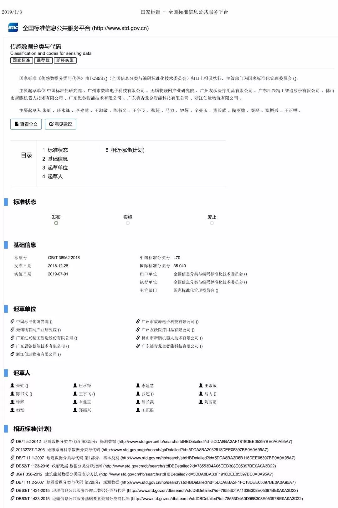 1月10日,國家市場監督管理總局、國家標準化管理委員會發布了《中華人民共和國國家標準公告》2018年第17號。由匯興智造參與起草的國家標準《傳感數據分類與代碼》獲準公布,并將于2019年7月1日開始實施。